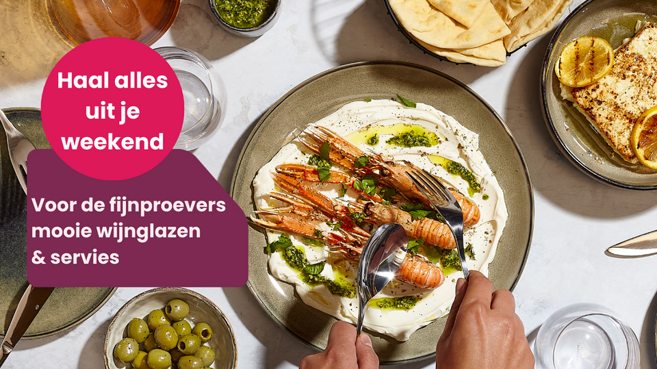 denk aan wijnglazen: Een goede maaltijd verdient een goede wijn, geserveerd in elegante wijnglazen. Deze glazen zijn ontworpen om het aroma en de smaak van uw wijn te versterken, waardoor uw dinerervaring naar een hoger niveau wordt getild. Kies uit topmerken als Riedel en Schott Zwiesel.