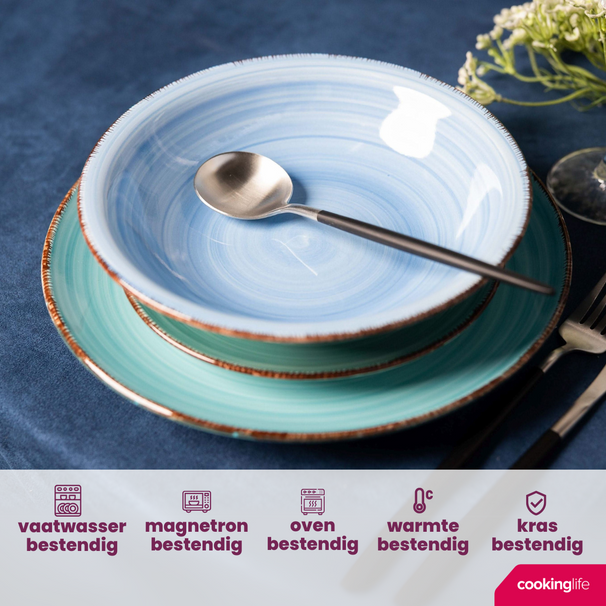 Cookinglife Serviesset Delice Blauw 18-delig / 6 personen - 6 dinerborden, 6 diepe borden en 6 ontbijtborden