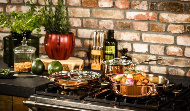 De puur koperen buitenlaag zorgen niet alleen voor een esthetisch uiterlijk, maar heeft ook belangrijke thermische eigenschappen. De reden dat professionals voor koperen pannen kiezen is door de uitstekende warmtegeleiding. Hierdoor warmt de pan gelijkmatig op en heb je dus betere controle over de kooktemperaturen. De stelen en handvaten van de pannen zijn hol, hierdoor worden deze nauwelijks warm tijdens het koken. Bovendien hebben de pannen een speciale bodem, waardoor ze geschikt zijn voor alle warmtebronnen.