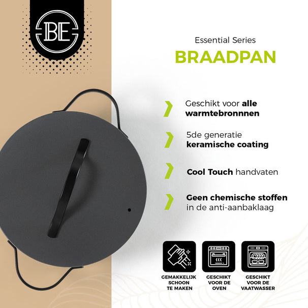BE Living Braadpan met deksel ø 28 cm - keramische anti-aanbaklaag - geschikt voor alle warmtebronnen - zwart