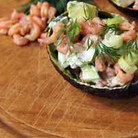 Gevulde avocado met garnalen is een simpel en gezond gerecht, ideaal als voorgerecht, lunch of lichte hoofdmaaltijd. Het vruchtvlees van avocado wordt gemengd met komkommer, lente-ui en Hollandse garnalen, en op smaak gebracht met een citroen-dille dressing. Het mengsel wordt teruggeschept in de avocadoschillen voor een aantrekkelijke presentatie zonder bakken.