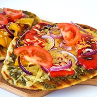 Naanbrood met pesto en gegrilde groenten is een snel en smakelijk vegetarisch gerecht, perfect voor lunch of diner. Het naanbrood wordt besmeerd met pesto en belegd met gegrilde aubergine, paprika, rode ui en tomaat, en vervolgens gegarneerd met geraspte kaas. Na 10 minuten in de oven ontstaat een kleurrijke, pizza-achtige maaltijd boordevol smaak.