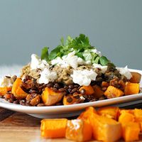 6. Doe de linzen met wortel op een bord, schep hier de pompoen doorheen. Hierop gaat een flinke schep gegrilde aubergine puree en een eetlepel Griekse yoghurt. Maak af met wat koriander (als je dat lekker vindt).