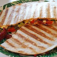 Quesadilla met cottage cheese is een eenvoudig en smakelijk vegetarisch gerecht, klaar in slechts 12 minuten. De wraps worden besmeerd met cottage cheese en gevuld met een mix van gebakken paprika, courgette, aubergine, ui en zongedroogde tomaatjes. Op smaak gebracht met oregano, worden de quesadilla’s in de grillpan gebakken tot ze knapperig zijn. Perfect voor een snelle Mexicaanse maaltijd met eindeloze variatiemogelijkheden.