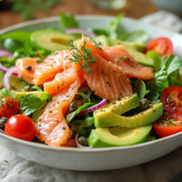 Salade met avocado, gerookte zalm en komkommer