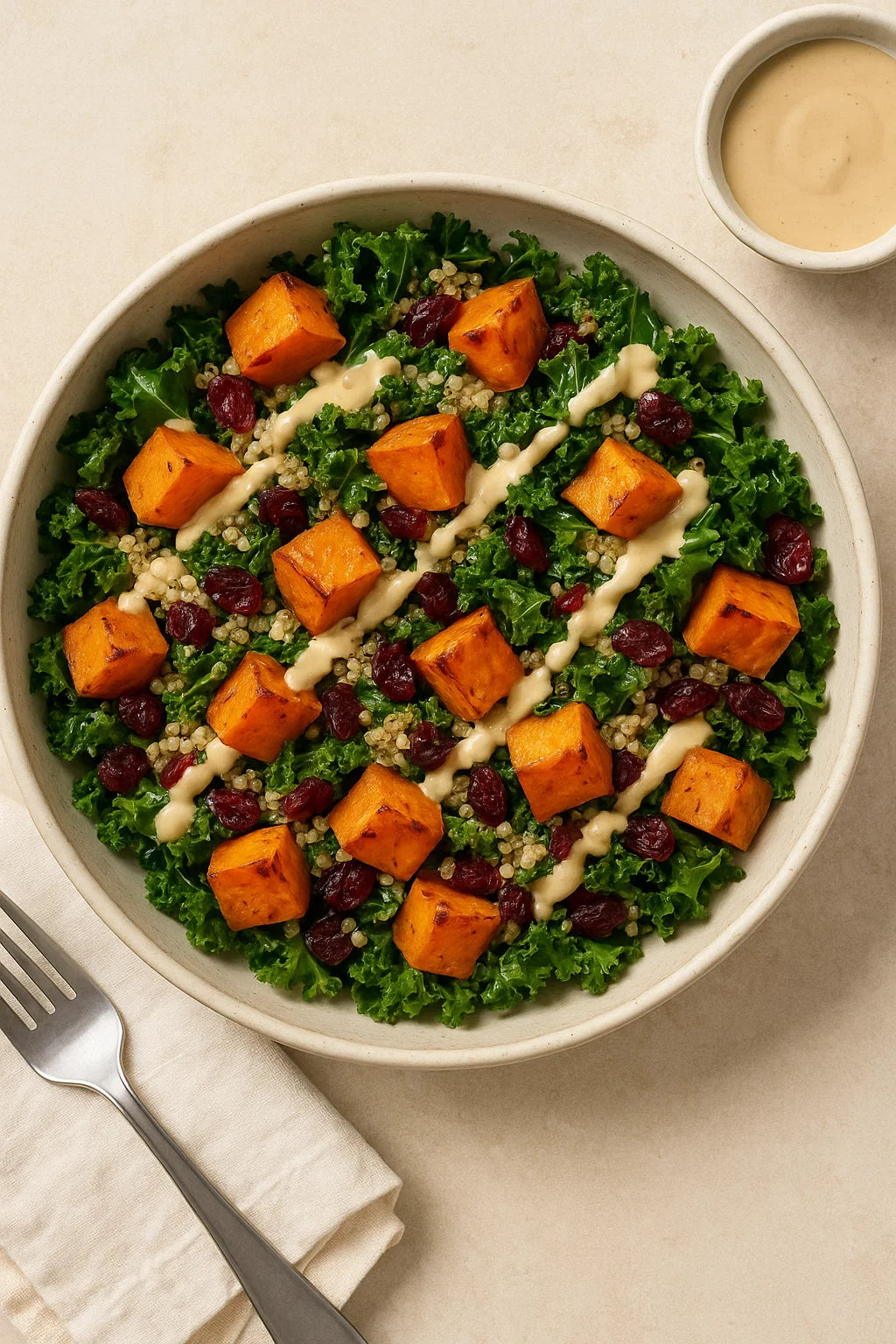 Een gezonde en vullende warme salade met zoete aardappel, boerenkool en tahini-dressing.
