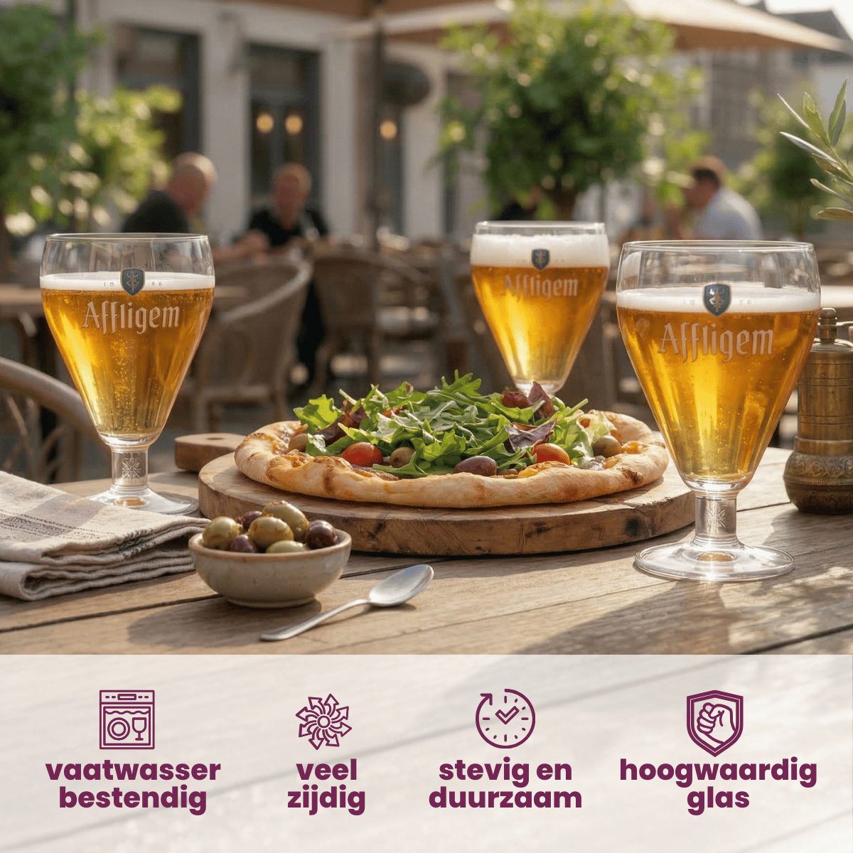 Deze set van twee Affligem bierglazen is ideaal voor het serveren van bier en andere koude dranken. Elk glas heeft een inhoud van 300 ml en een klassieke bierglasvorm die prettig drinkt. Het heldere glas laat de kleur en het bruisen van je drankje goed zien. Deze set is geschikt voor gezellige momenten thuis met vrienden of familie.