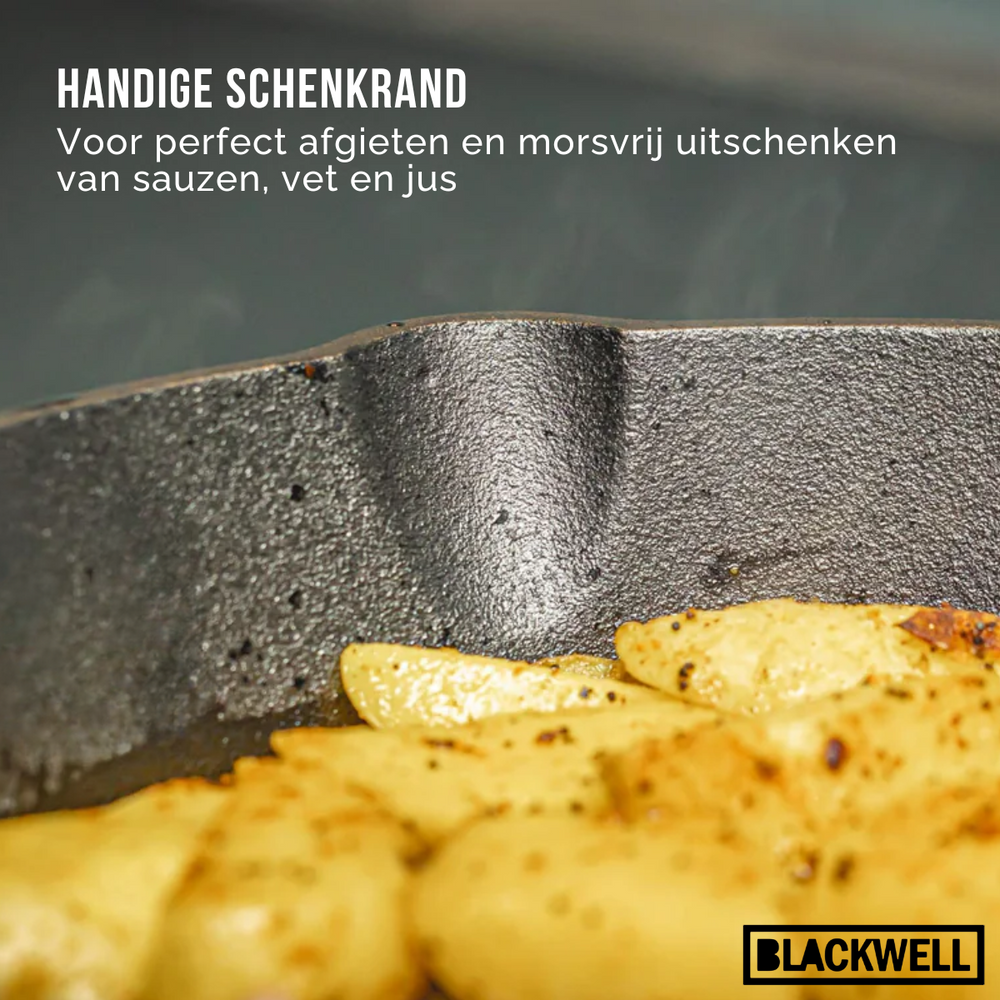 Omdat deze Blackwell koekenpan geen anti-aanbaklaag heeft, is het belangrijk om deze Blackwell koekenpan te seasonen. Handwas en direct afdrogen wordt aanbevolen om de kwaliteit van het gietijzer te behouden en om roestvorming te voorkomen.