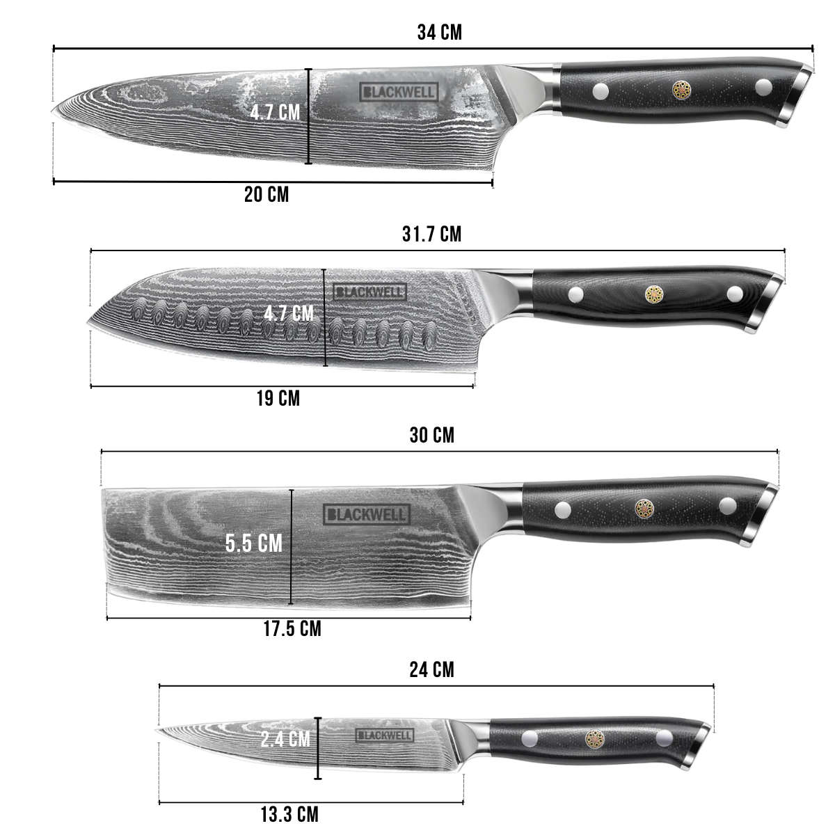 Blackwell Messenset (Koksmes + Santokumes + Nakirimes + Officemes) - Japanse stijl - 67 lagen damaststaal - VG10 - 4-delig