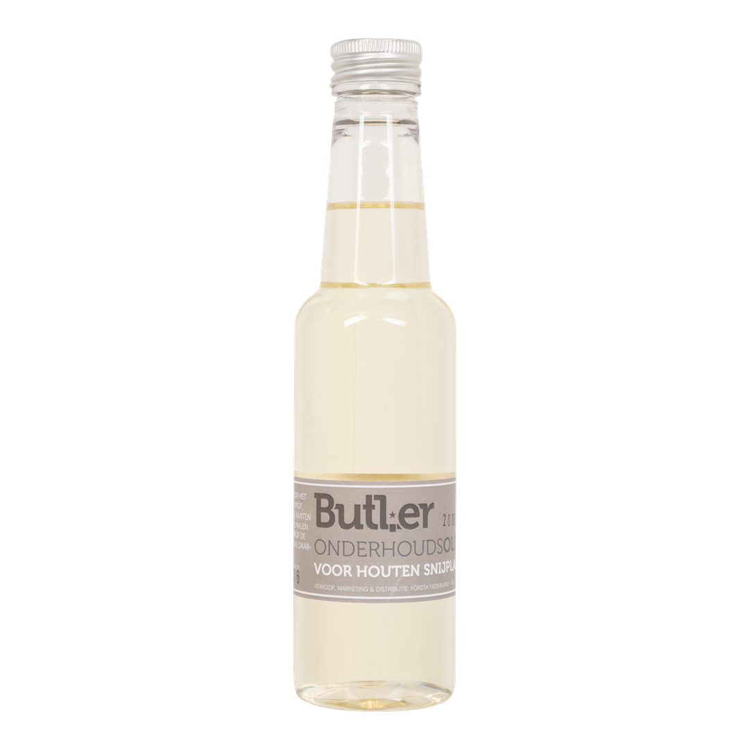 Deze essentiële olie van Butler is absoluut noodzakelijk voor een goede verzorging van een houten snijplank. Het is verstandig om een houten snijplank goed in te smeren met deze olie voordat je hem gaat gebruiken, en ook regelmatig daarna te oliën. Zo verminder je de kans op scheurtjes en verleng je de levensduur.