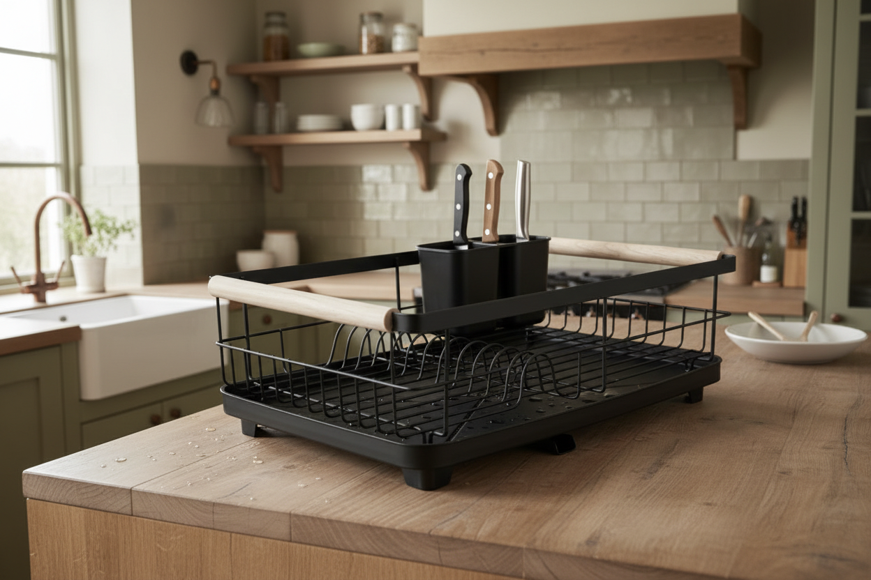 Het Cookinglife afdruiprek van metaal is een praktische en stevige oplossing om je borden, glazen en bestek efficiënt te laten drogen na het afwassen. Met een compact formaat van 42 x 30 x 4 cm past dit afdruiprek op vrijwel elk aanrecht en biedt het voldoende ruimte voor dagelijkse vaat. Het metalen frame is sterk en duurzaam, wat zorgt voor een stabiele positie van je servies tijdens het drogen. Door het open ontwerp kan water gemakkelijk weglopen, waardoor je keuken schoon en georganiseerd blijft.