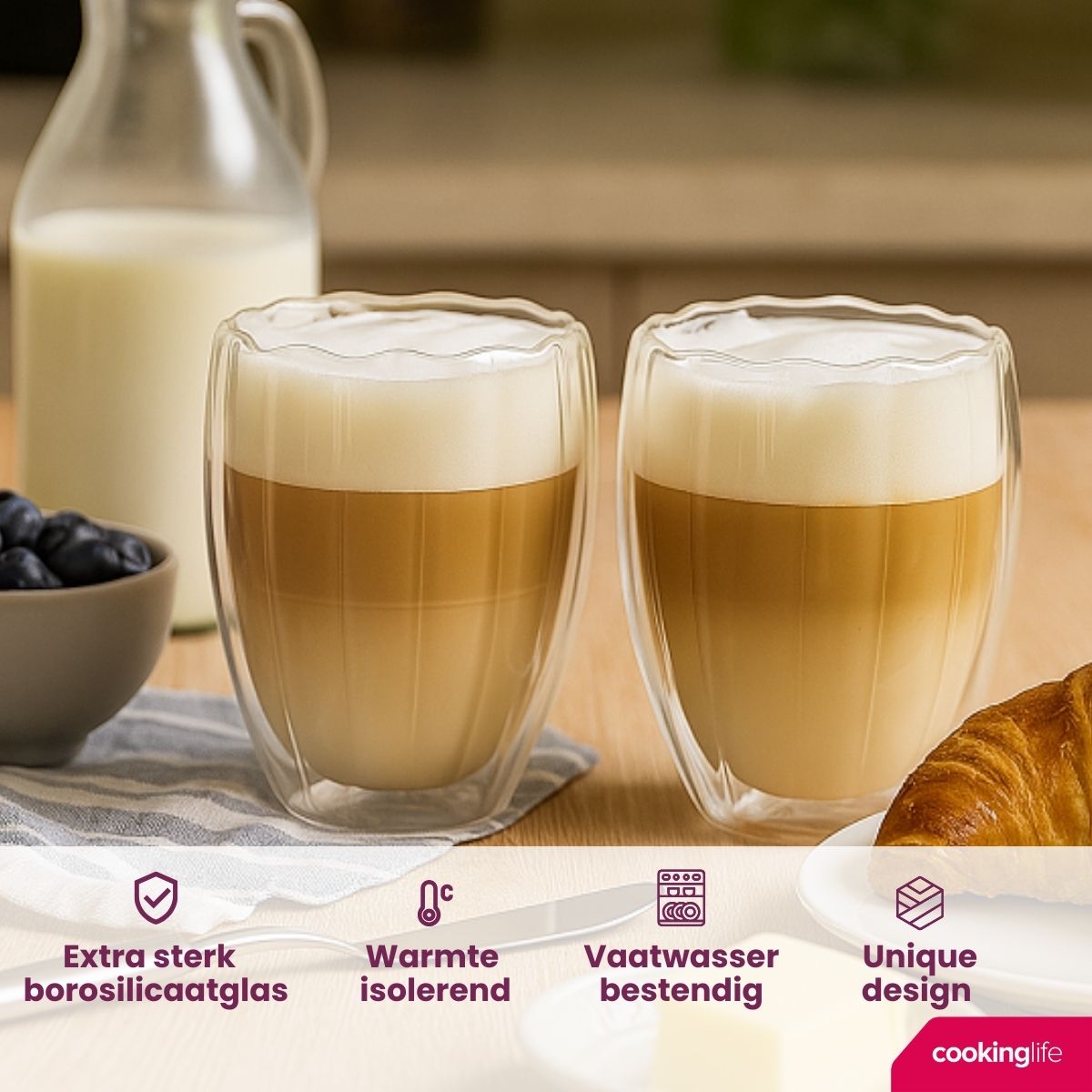 De Cookinglife Dubbelwandige Latte Macchiato glazen Pumpkin (300 ml) geven je koffiemoment een speelse en warme uitstraling. Het dubbelwandige ontwerp houdt je drankje lang op temperatuur en zorgt dat het buitenoppervlak koel blijft om vast te pakken. Het pompoen-achtige design voegt een vrolijke, seizoensgebonden touch toe en laat de lagen van een latte macchiato mooi zien. De set van 2 is perfect voor thuisgebruik of als origineel cadeautje.