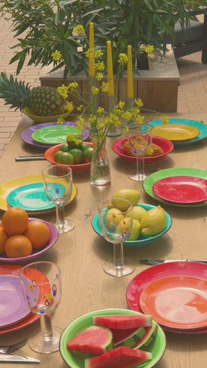 De vrolijke en felle kleuren brengen een vleugje zomer naar de tafel