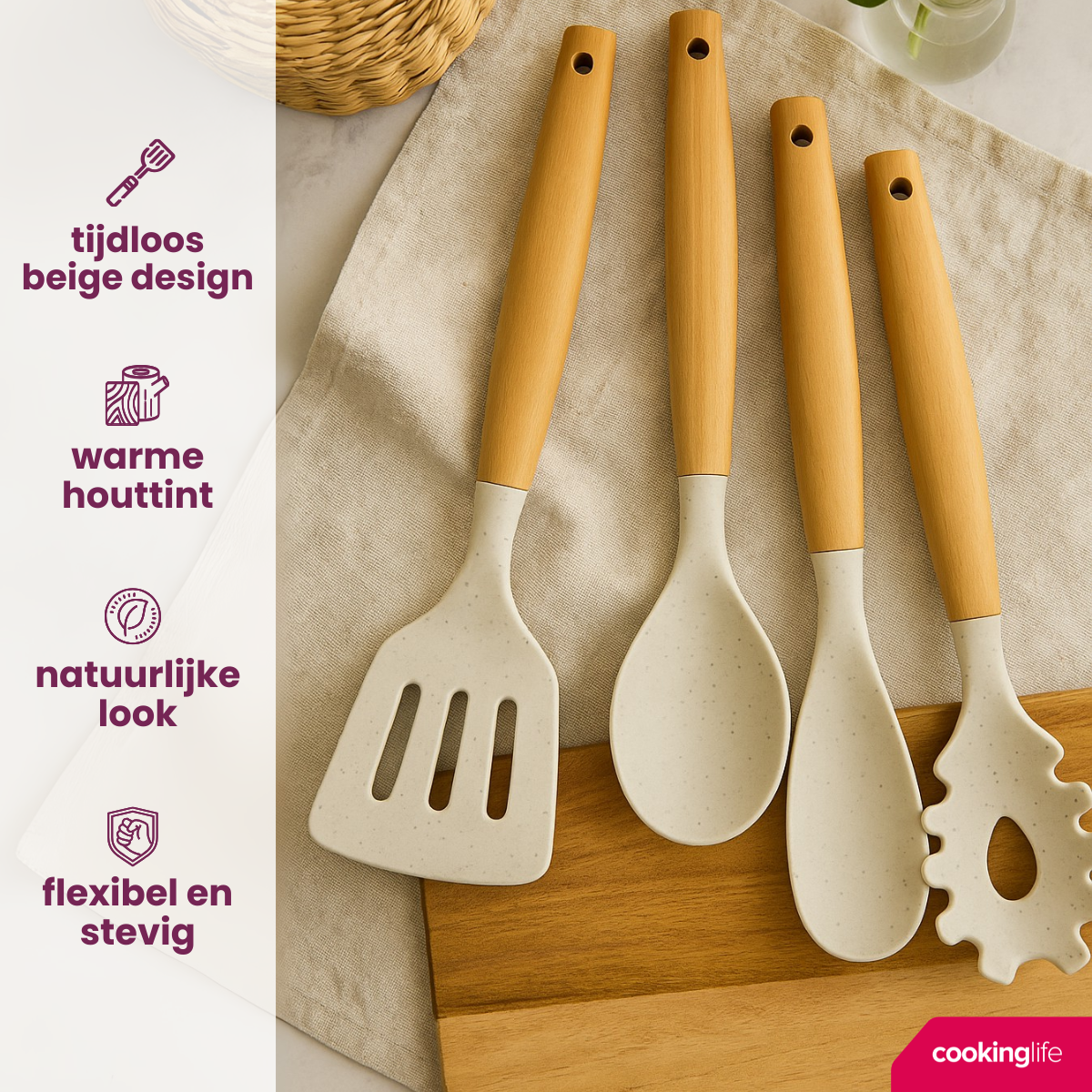 De Cookinglife Keukengerei set is een praktische en stijlvolle aanvulling op iedere keuken. De set bevat vier veelgebruikte tools met warme houten handvatten en zachte siliconen koppen. Door het lange formaat houd je handen op veilige afstand van hitte tijdens het koken. De rustige beige kleur past goed bij moderne en landelijke keukens.