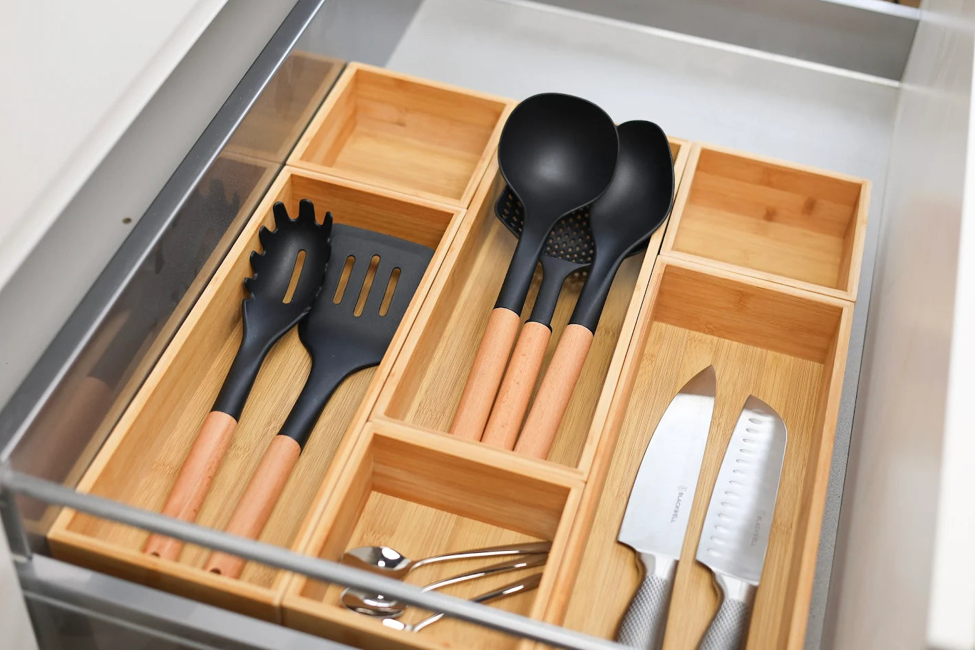 Deze set is niet vaatwasserbestendig; reinig alle onderdelen met de hand. Dompel houten handvatten niet langdurig in water en laat ze goed drogen om kromtrekken of barsten te voorkomen.