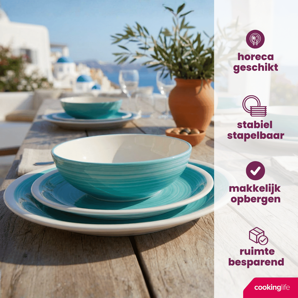Tafelen voor acht begint hier. De Cookinglife Serviesset Ocean Turquoise is die complete, slimme keuze die je kastje in een keer vult en je tafel in een keer op orde heeft. Geen losse stukken zoeken, geen mismatch, geen compromis - gewoon servies dat er goed uitziet, lang meegaat en elke maaltijd net een beetje smakelijker maakt. Voeg de set vandaag toe aan je winkelwagen en zet de tafel klaar voor het volgende moment om samen van te genieten.