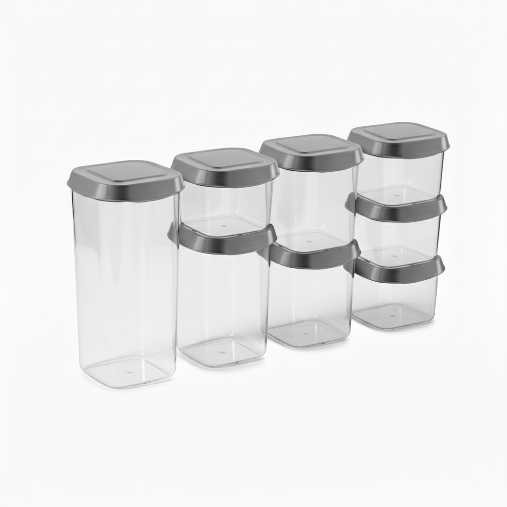 Met deze set van acht stijlvolle voorraadpotten met grijze deksels haal je orde en design in één keer in huis. De potten zijn doorzichtig, zodat je direct ziet wat erin zit, en de grijze deksels geven je keuken een rustige, moderne uitstraling. Dankzij de afsluitbare houders kun je droge producten zoals koffie, granen of koekjes vers bewaren. Een ideale set voor wie overzicht en stijl belangrijk vindt in de keuken.