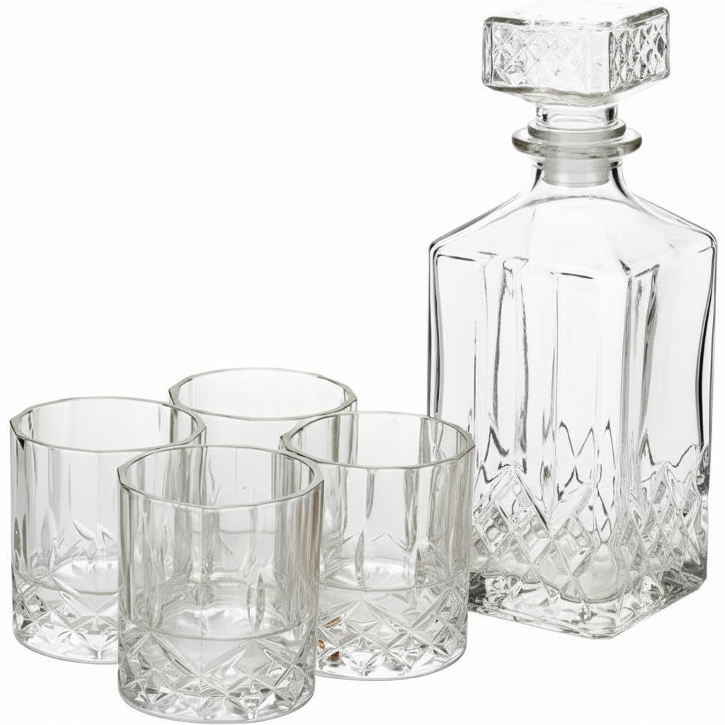 Met deze set haal je een stijlvolle karaf van 900 ml met bijpassende glazen in huis. De transparante glazen karaf met dop houdt je drank mooi en fris, terwijl de vier meegeleverde glazen perfect zijn voor samen genieten. Een fijn basisset voor dagelijks gebruik of een gezellige avond.