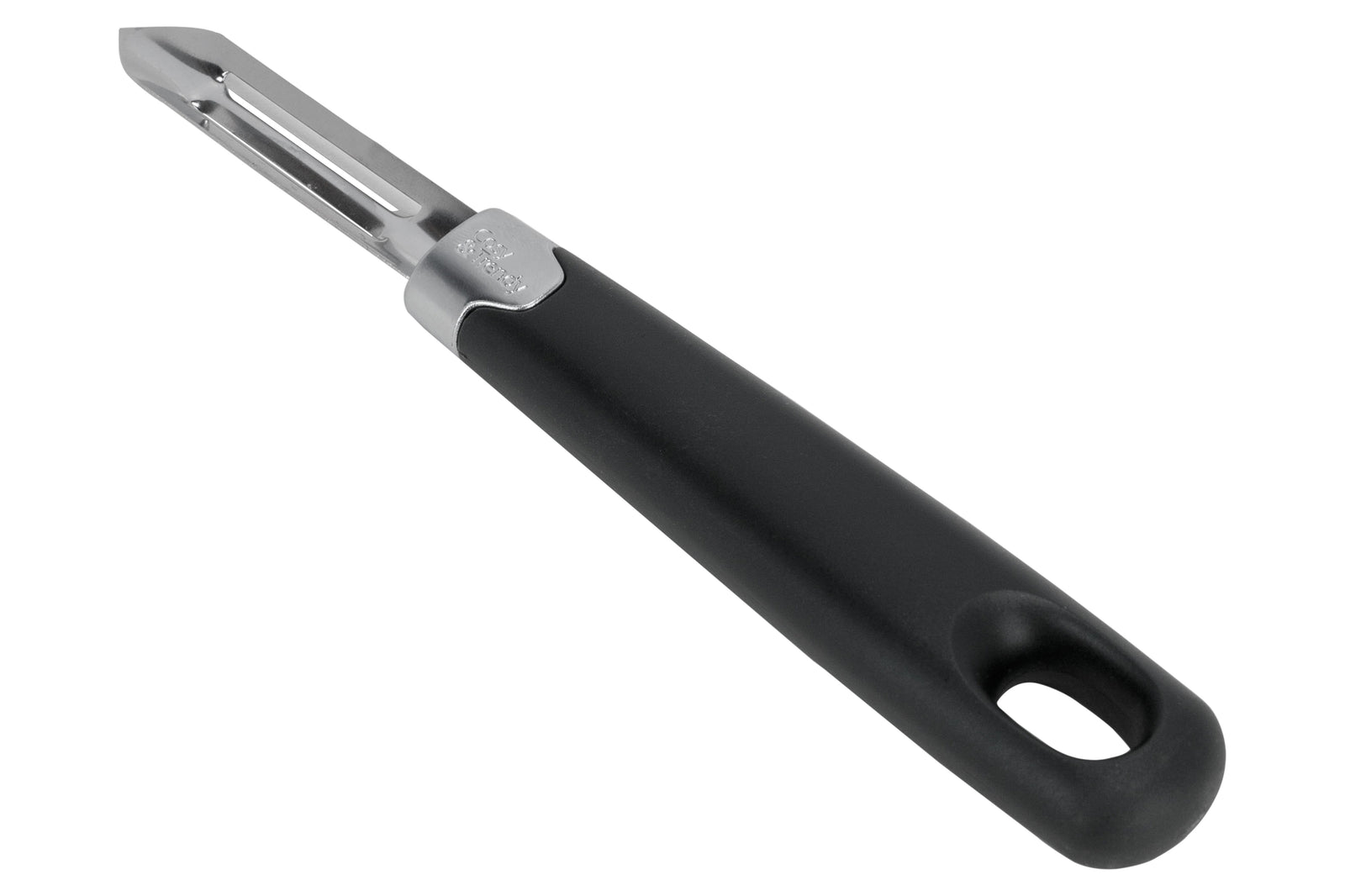 De dunschiller heeft een scherp mes, ga voorzichtig te werk en houd hem buiten bereik van kinderen. Hoewel de schiller vaatwasserbestendig kan zijn, verlengt handwas met warm water en direct afdrogen de levensduur en behoudt het mes langer zijn scherpte. Gebruik de schiller niet op zeer harde of bevroren producten en voorkom scherpe stoten die het mes kunnen beschadigen.