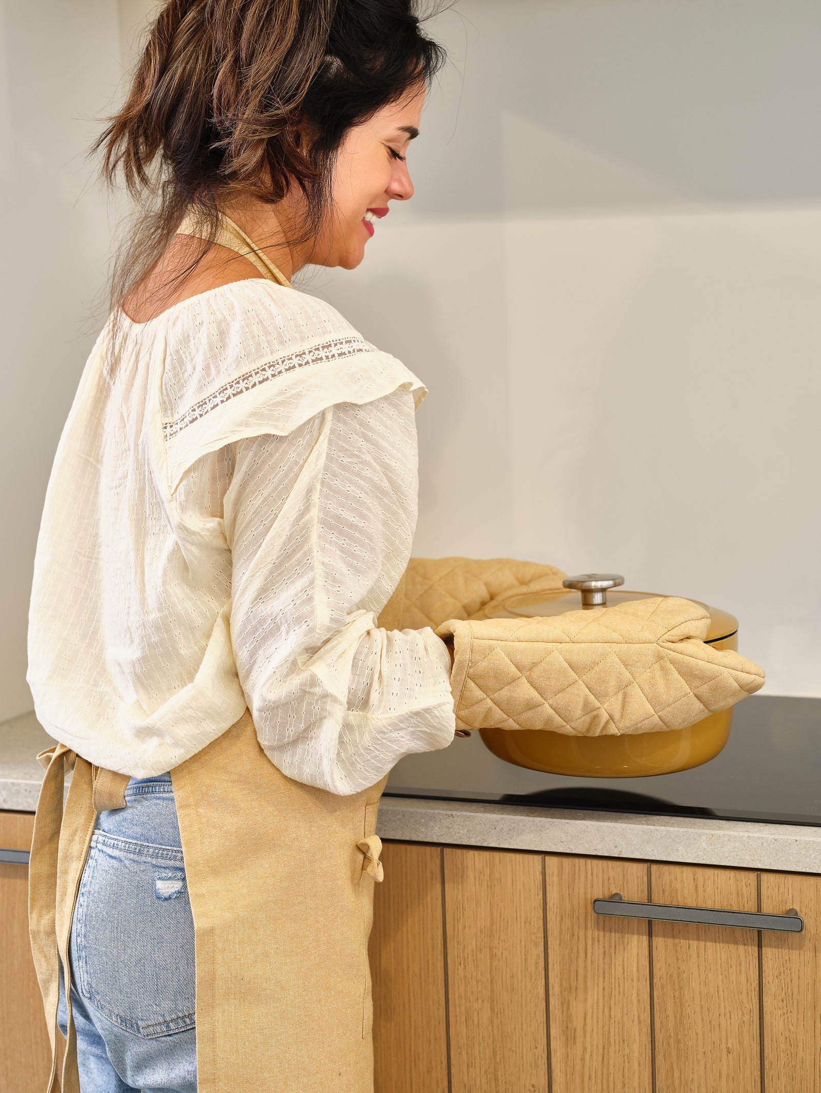 Vul je keuken met warmte en luxe met deze ovenwant van Cosy Trendy in gouden tint. De dichtgeweven katoen buitenlaag en isolerende polyester vulling beschermen tegen hitte tot ca. 200 °C. Het royale formaat (31 × 15 × 3 cm) bedekt hand en pols compleet. Dankzij het ophangoog blijft je ovenwant netjes opgeborgen.