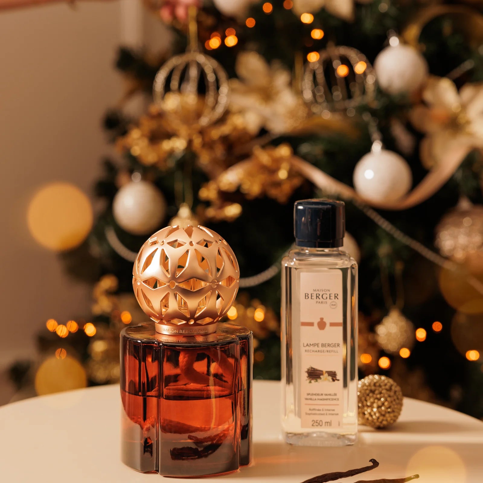 Deze stijlvolle giftset brengt warmte, geur en elegantie in je interieur. De geurbrander is uitgevoerd in een diepe chocoladebruine kleur met subtiele goudaccenten, wat zorgt voor een luxe en moderne uitstraling. Het meegeleverde parfum biedt een rijke geurbeleving met frisse, kruidige en romige noten. Dankzij de katalytische werking zuivert de lamp bovendien de lucht terwijl de geur zich gelijkmatig verspreidt.