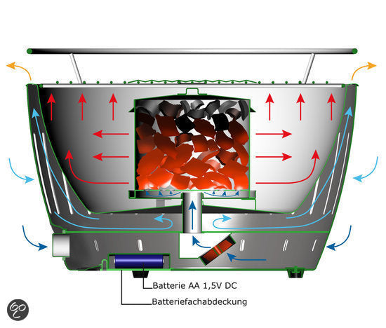 Een optimale luchtcirculatie wordt verkregen door een ventilator die werkt op 4 AA-batterijen or USB-kabel wanneer batterij uzijn uitgeput zijn. Deze compacte barbecue is ideaal voor gezelschappen tot 5 personen en wordt standaard geleverd in een stevige nylon draagtas, gemakkelijk overal mee naartoe te nemen!