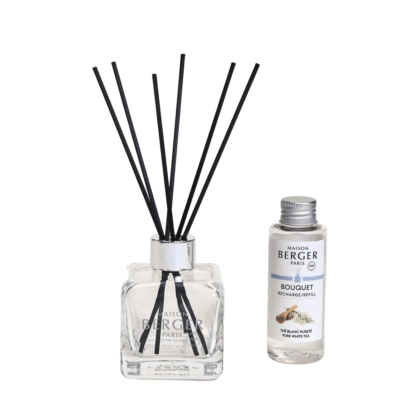 Met de Maison Berger geurstokjes Pure White Tea geniet je van een verfijnde en serene geur die rust brengt in huis. De combinatie van frisse bergamot en cassis met bloemige tonen van witte thee, jasmijn en roos zorgt voor een elegante, pure beleving. De kubusvormige fles met minimalistisch design past perfect in elk interieur en verspreidt langdurig een zachte, neutrale geur.