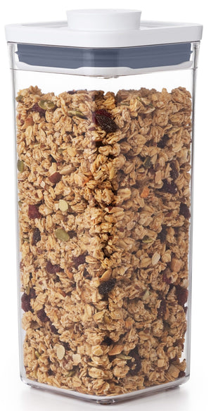 Deze grote voorraadbus 'POP 2.0' van OXO Good Grips sluit luchtdicht af en is ideaal voor het bewaren van droge voedingswaren. Zoals bijvoorbeeld noten en zoutjes. Hij doet ook perfect dienst als handige opbergdoos in de garage, naairuimte of speelkamer. Deze POP Container heeft dekseltype A. Met de grote drukknop op de bovenzijde open en sluit je de voorraadbus met één hand. De knop zorgt voor een luchtdichte afsluiting en dient bovendien als handvat om het deksel van de doos te nemen. Onder het deksel is plek om een handige accessoire vast te klikken, zoals een schepje of een datumschijf. Het deksel haal je eenvoudig uit elkaar voor grondig schoonmaken.