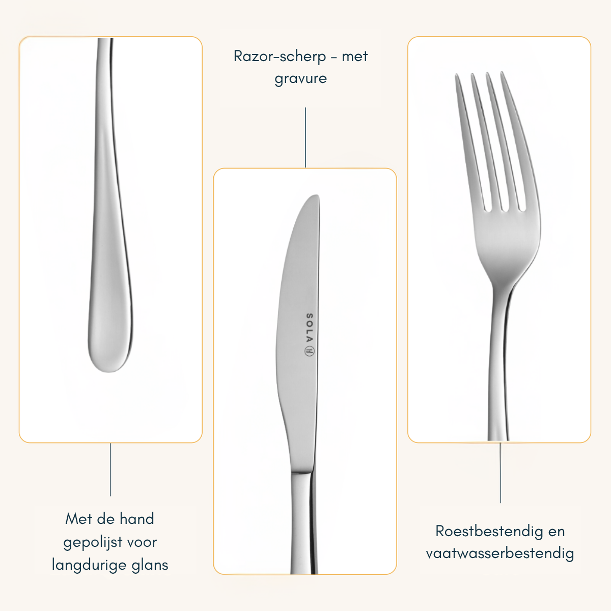 Met de Sola Bestekset Florence kies je voor kwaliteit, stijl en gebruiksgemak. Voeg een vleugje elegantie toe aan je tafel en geniet van een bestekset die zowel praktisch als prachtig is.