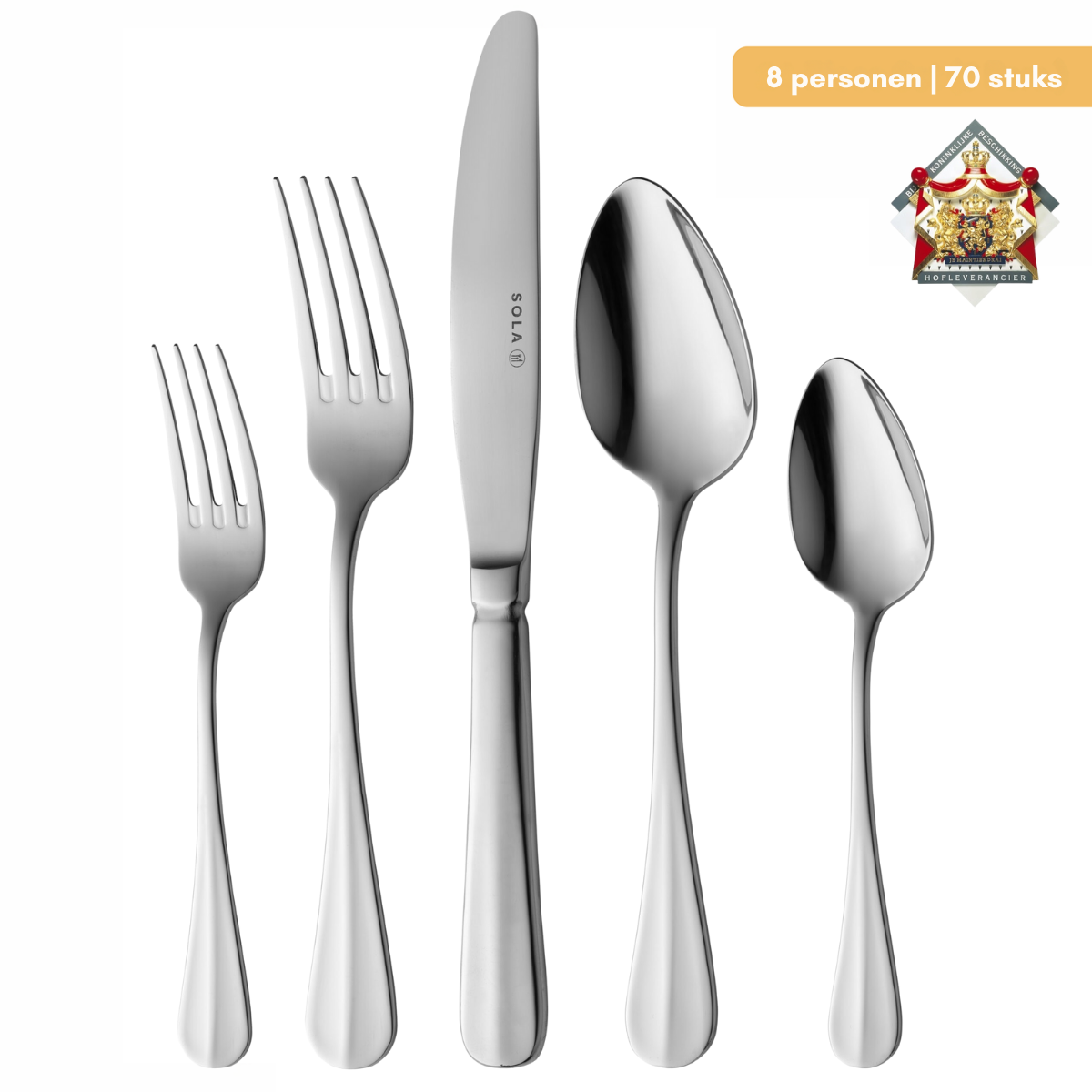 Ben jij toe aan nieuw bestek en ga je voor kwaliteit? Deze Sola bestekset Hollands Glad is een 70-delige set, opgebouwd uit alle benodigde bestek onderdelen in de keuken. Sola bestek is gemaakt van zilverwit 18/10 edelstaal. Zilverwit edelstaal 18/10 is een staallegering van 18 delen chroomstaal en 10 delen nikkel. Door deze samenstelling is het bestek roestvrij en vaatwasser geschikt. Deze set bestaat uit: