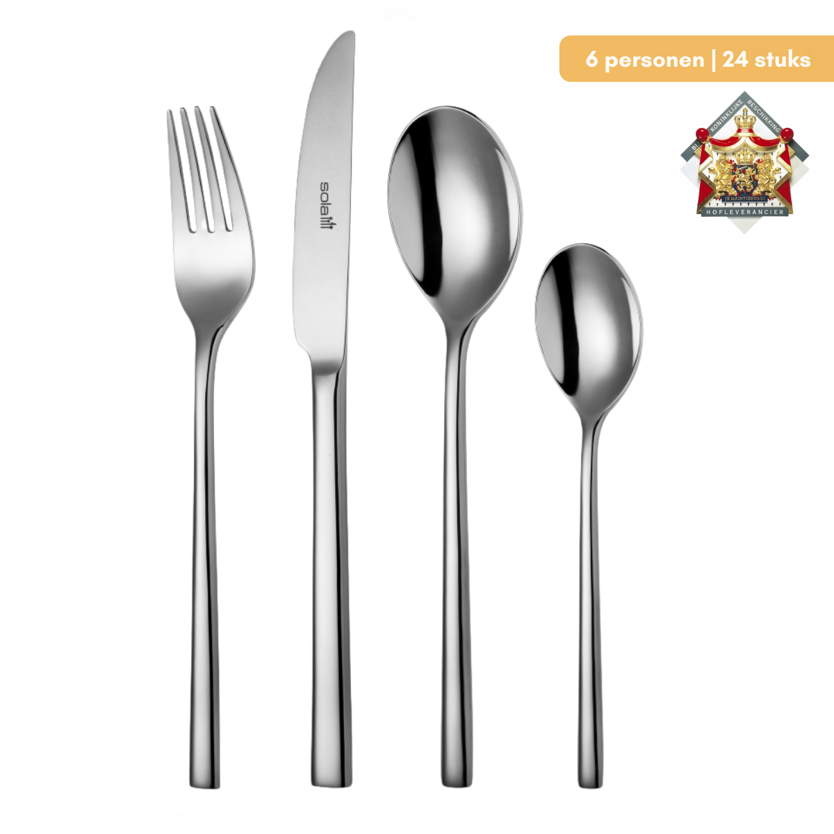 Ben jij toe aan nieuw bestek en ga je voor kwaliteit? Deze Sola bestekset Montreux is een 24-delige set, opgebouwd uit de meest gebruikte bestek onderdelen in de keuken. Sola bestek is gemaakt van zilverwit 18/10 edelstaal. Zilverwit edelstaal 18/10 is een staallegering van 18 delen chroomstaal en 10 delen nikkel. Door deze samenstelling is het bestek roestvrij en vaatwasser geschikt. Deze set bestaat uit: