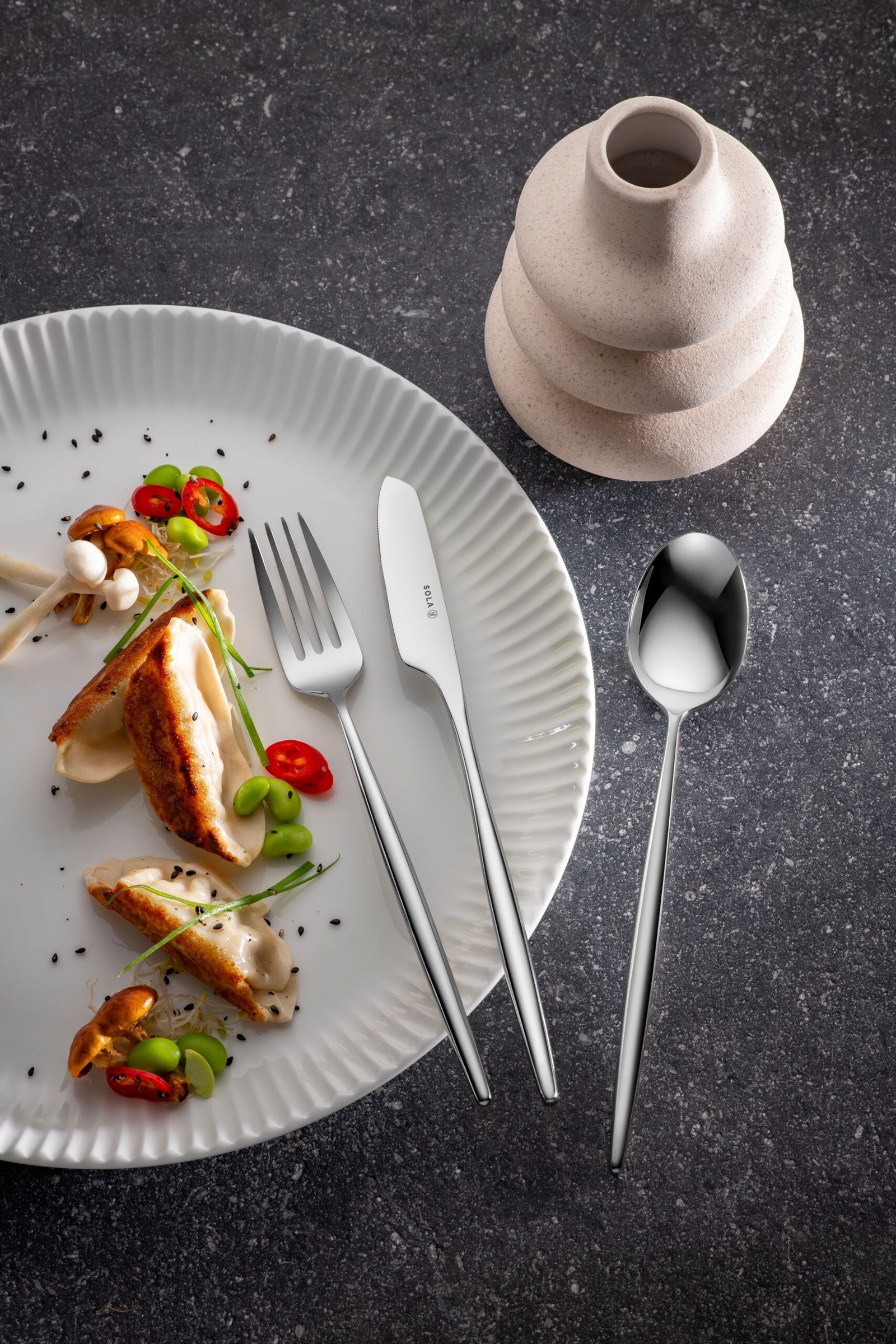 De Sola Osaka bestekset 6-persoons 24-delig heeft een strak en eigentijds ontwerp dat perfect past bij modern tafelen. Het bestek is ontworpen met een rustige vormgeving zonder overbodige details en ligt prettig in de hand tijdens het eten. Dankzij het tijdloze karakter is deze set geschikt voor dagelijks gebruik en eenvoudig te combineren met verschillende serviesstijlen.