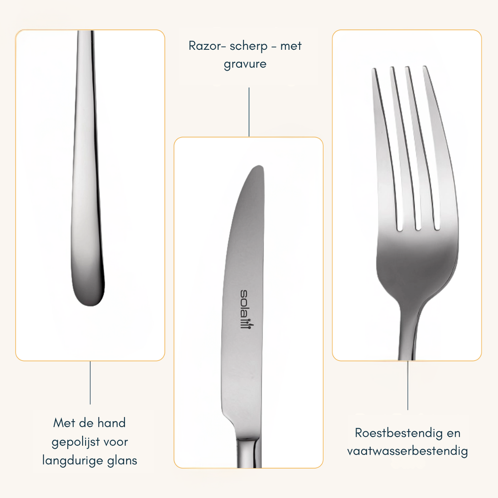 Stel u voor: een feestelijk diner waarbij uw gasten onder de indruk zijn van de elegante uitstraling van uw tafel. Of een drukke ochtend waarbij u snel en gemakkelijk uw bestek kunt reinigen in de vaatwasser. Met de Sola Bestekset Ibiza bent u altijd voorbereid.