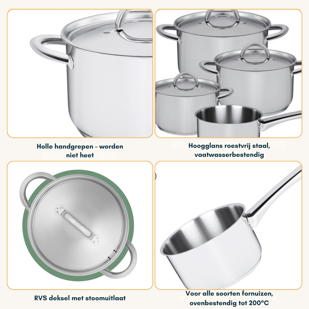 Gemaakt van hoogwaardig roestvrij staal, biedt deze pannenset een lange levensduur en uitstekende prestaties. Na gebruik kun je de pannen eenvoudig reinigen in de vaatwasser, zodat je meer tijd hebt om te genieten van je maaltijd en minder tijd kwijt bent aan schoonmaken.