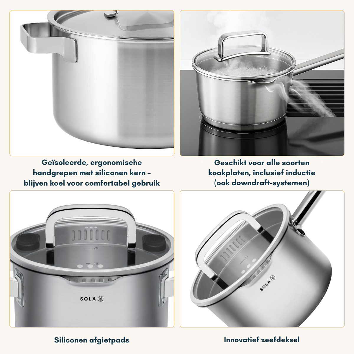 • Sola Pannenset Juvia - RVS - Kookpan ø 16, 18, 20, 24 cm & Steelpan ø 16 cm - Inductie & Downdraft geschikt - 5 Delig