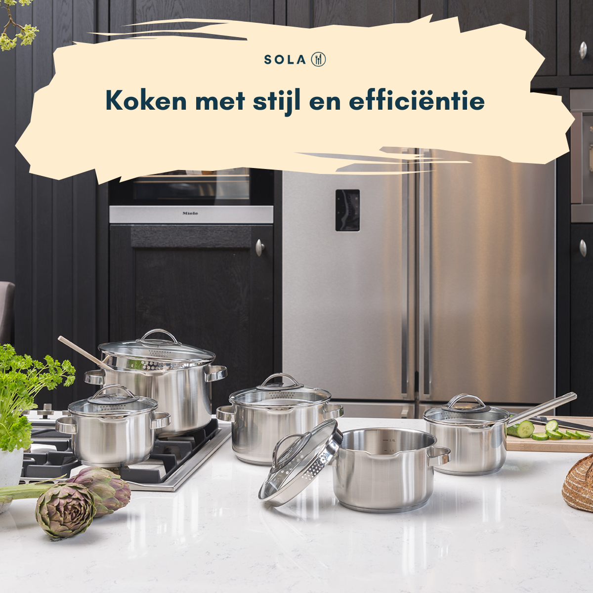 Maak van elke maaltijd een succes met de Sola Pannenset Pearl. Deze stijlvolle en duurzame pannenset is speciaal ontworpen voor hobbykoks en culinaire liefhebbers die waarde hechten aan kwaliteit en functionaliteit. Dankzij de inductiegeschiktheid en hoogwaardige materialen biedt deze set een efficiënte kookervaring met gelijkmatige resultaten.