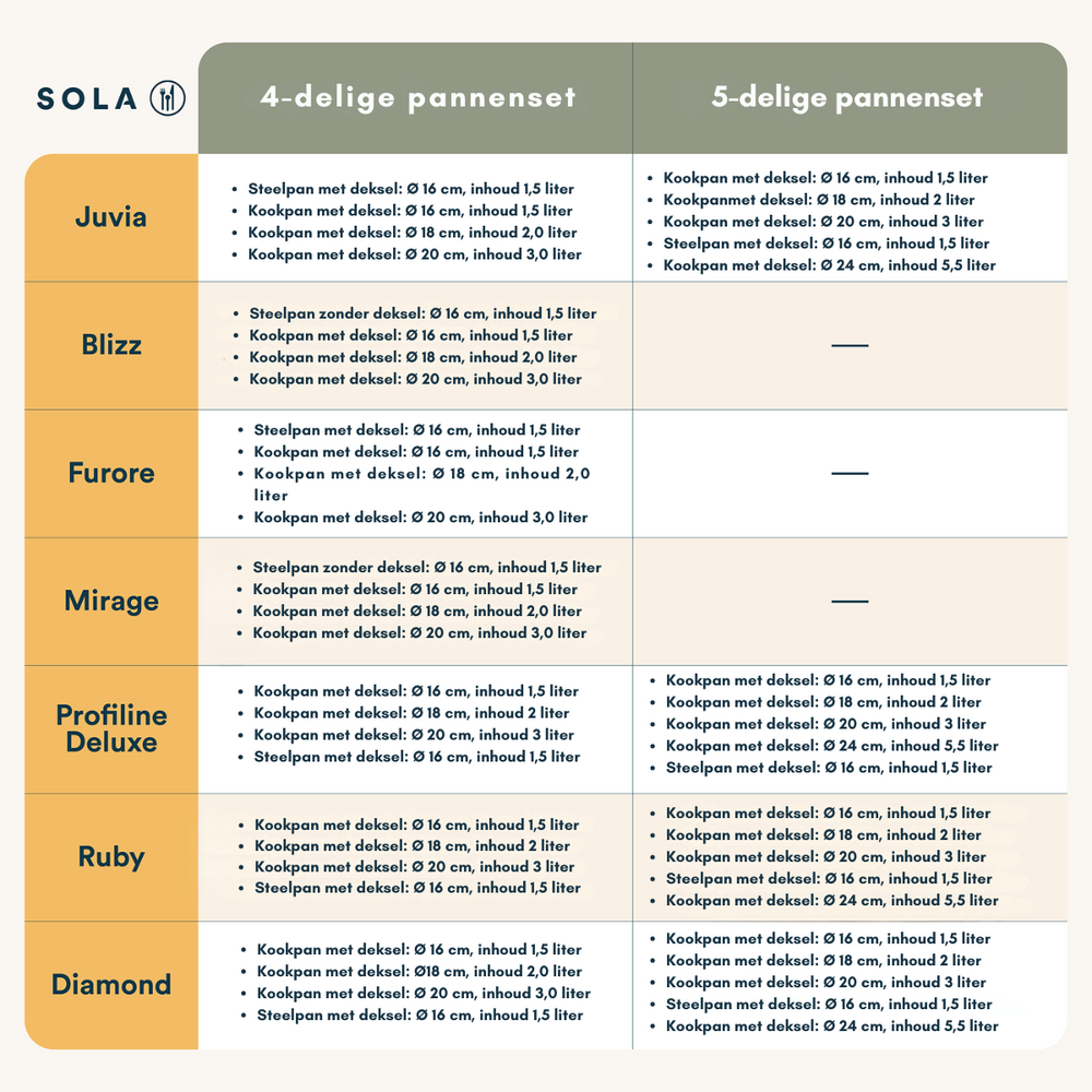 Met de Sola Profiline Deluxe pannenset haal je een veelzijdige en duurzame keukenuitrusting in huis die perfect aansluit bij jouw kookbehoeften. Of je nu een hobbykok bent of gewoon op zoek bent naar een complete pannenset, deze set biedt alles wat je nodig hebt voor heerlijke gerechten, elke dag opnieuw.