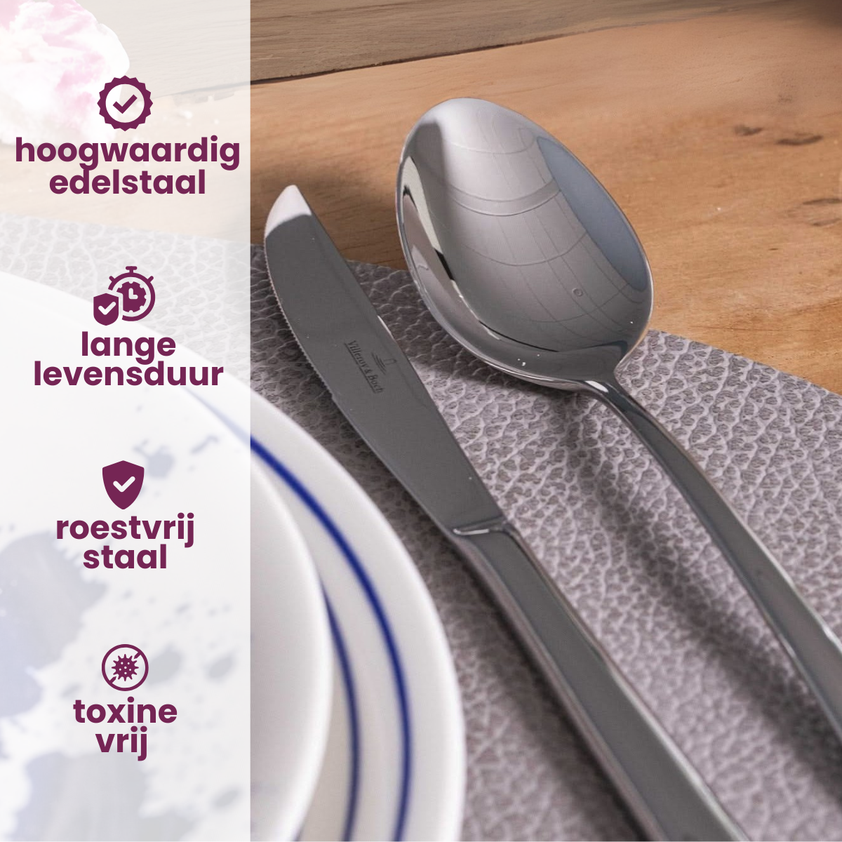De Villeroy & Boch Piemont bestekset is vaatwasserbestendig, wat het schoonmaken na gebruik moeiteloos maakt. Voor het beste resultaat raden wij aan het bestek na het wassen goed af te drogen om watervlekken te voorkomen.