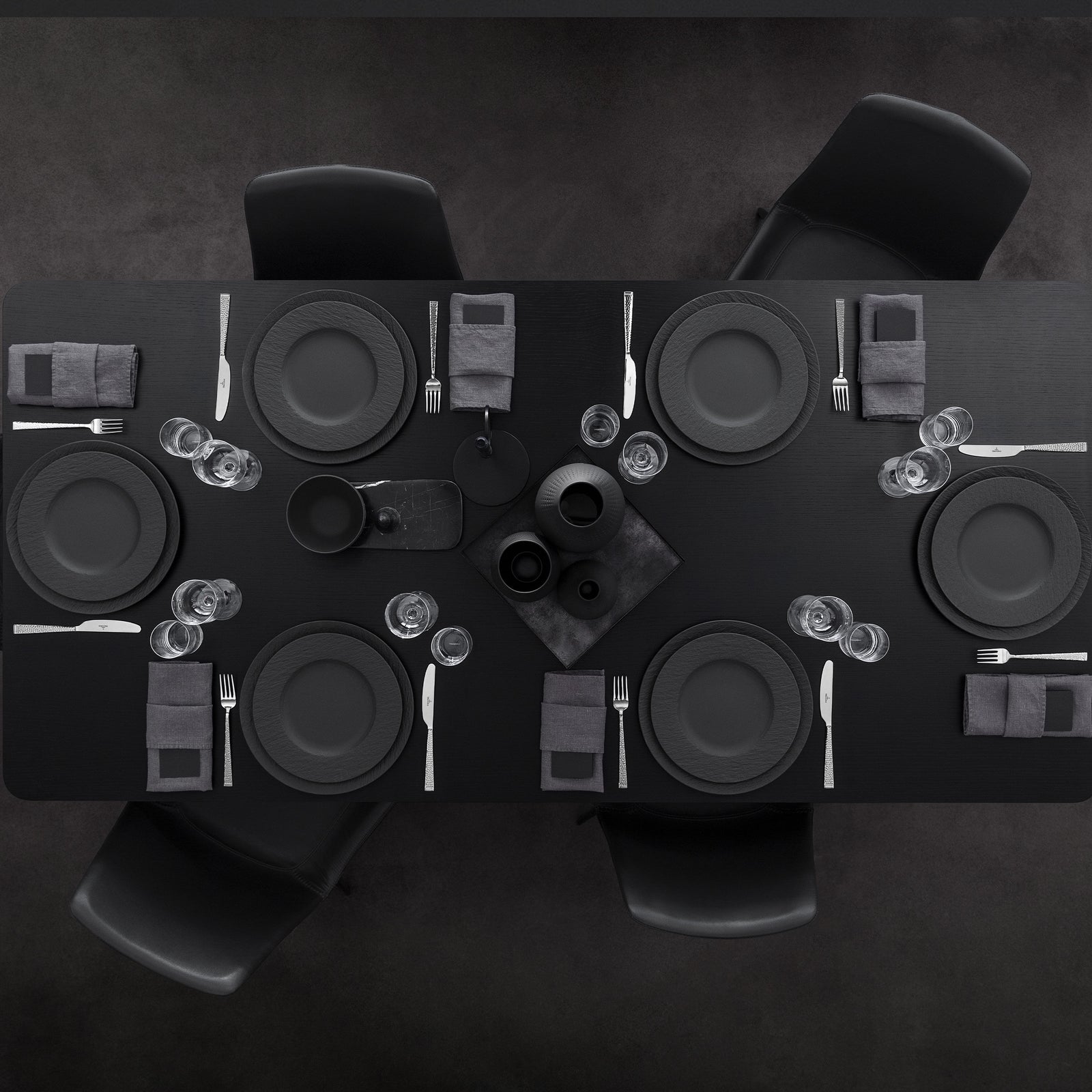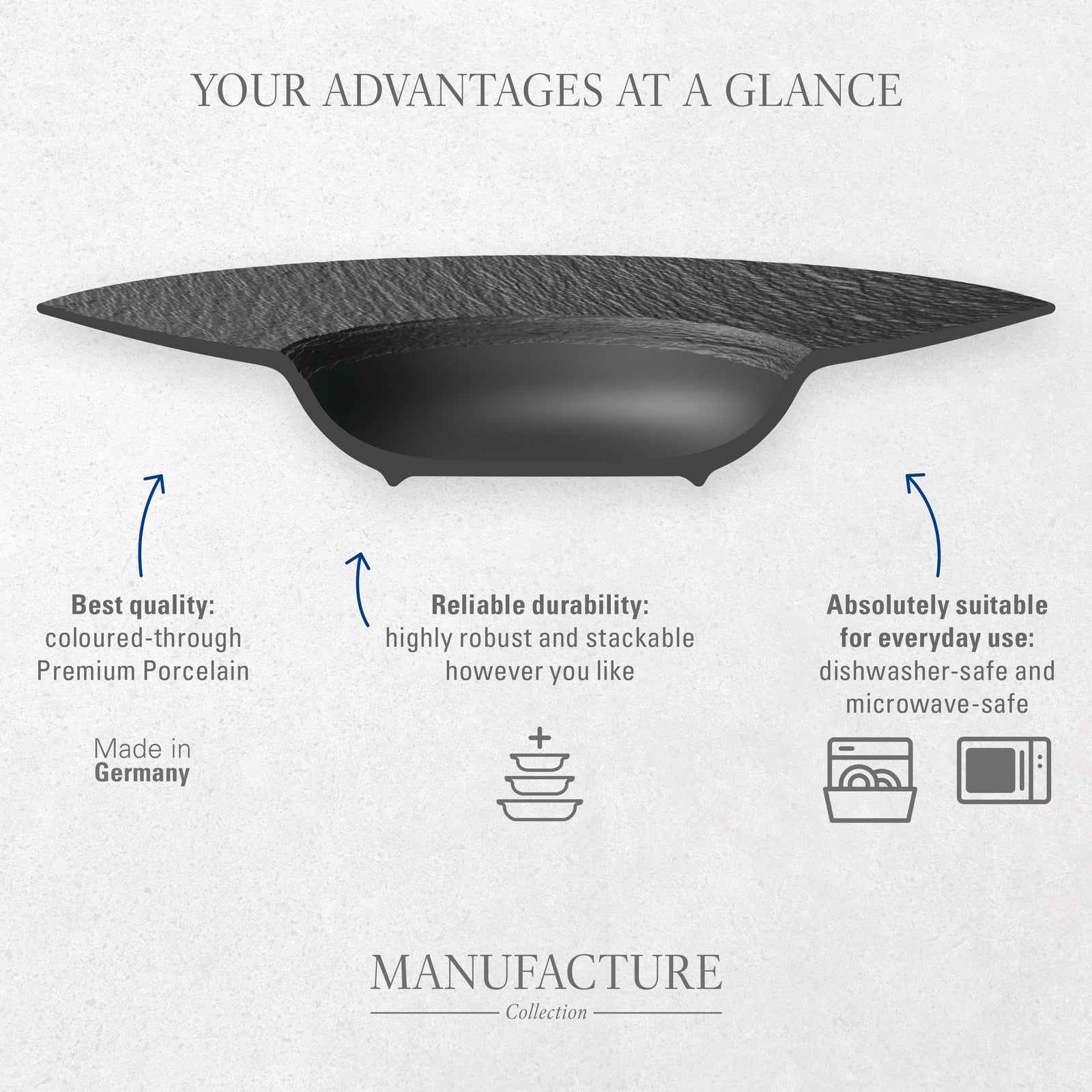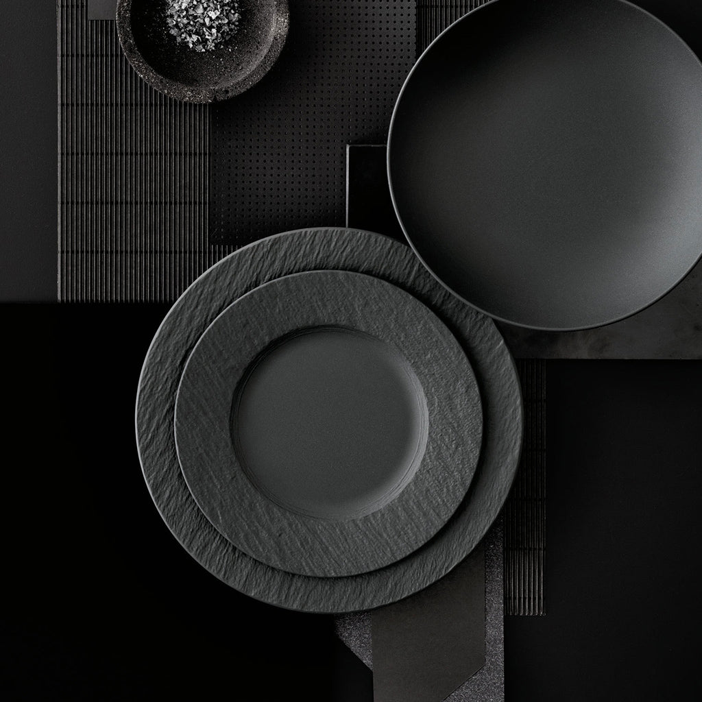 Er is iets bijzonders aan wat een mooi bord doet met een gerecht. Hetzelfde stuk gegrilde zalm of die zelfgemaakte risotto smaakt gewoon beter als het geserveerd wordt op een bord dat er goed uitziet. Het zwarte mat-gestructureerde oppervlak van de Manufacture Rock laat warme kleuren - denk aan oranje, geel, groen - letterlijk oplichten. Je gerecht wordt de hoofdrol, het bord speelt de perfecte bijrol.