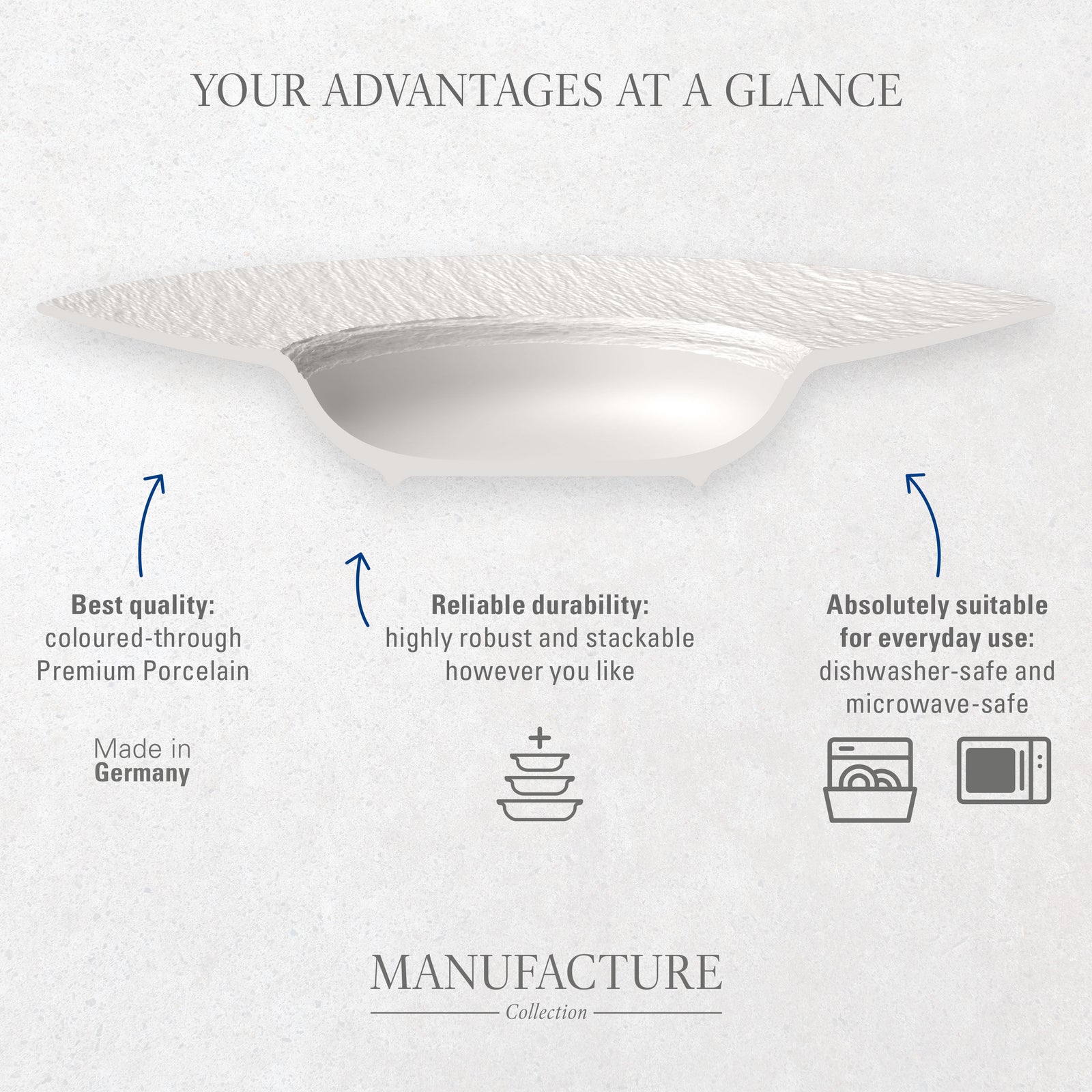 Met een diameter van 31,5 cm en die kenmerkende leisteen-look in hoogwaardig porselein combineert dit bord ambachtelijke stijl met no-nonsense gebruiksgemak. Gemaakt in Duitsland, ontworpen om jarenlang mee te gaan - dit is slim kopen.